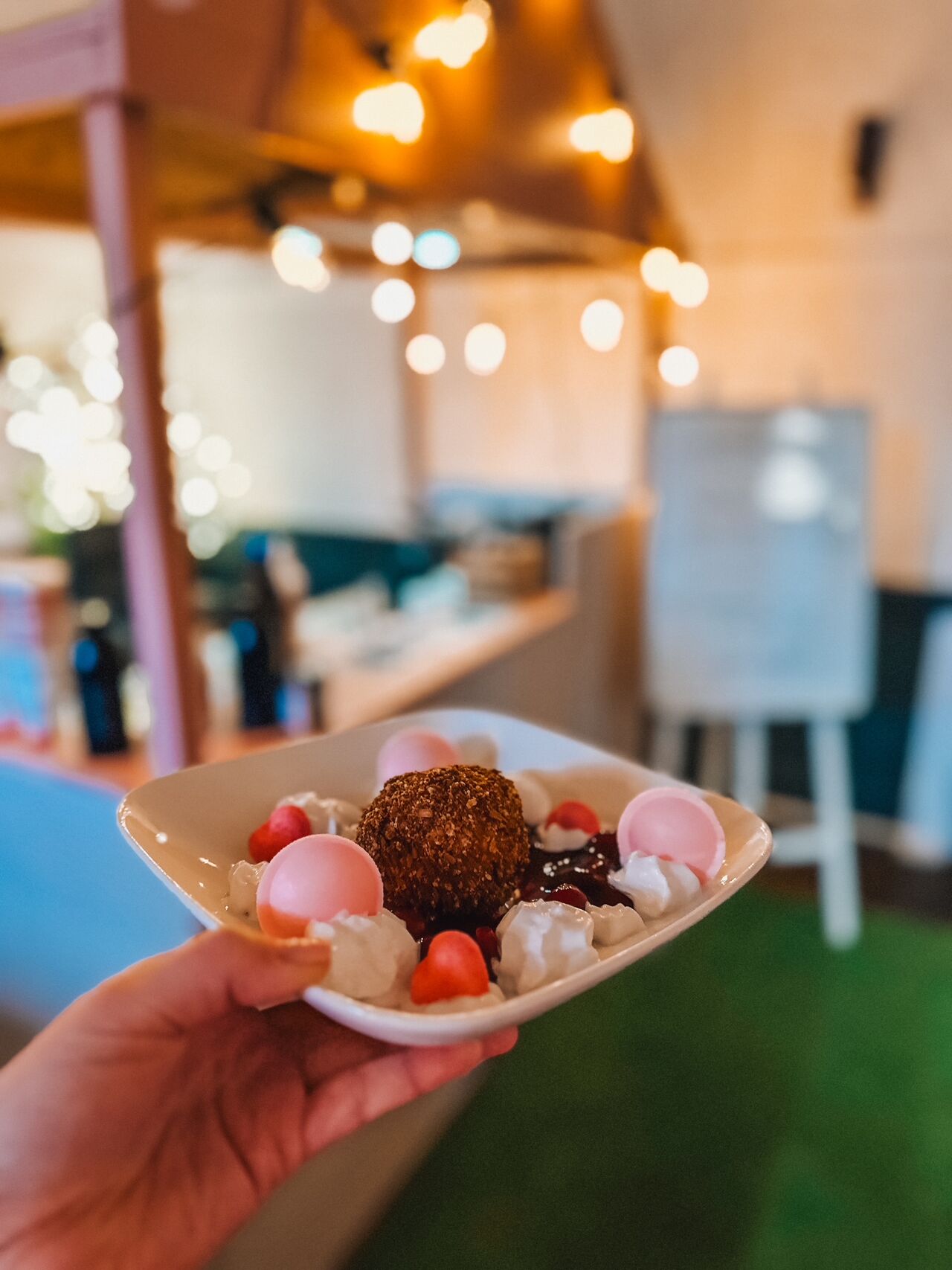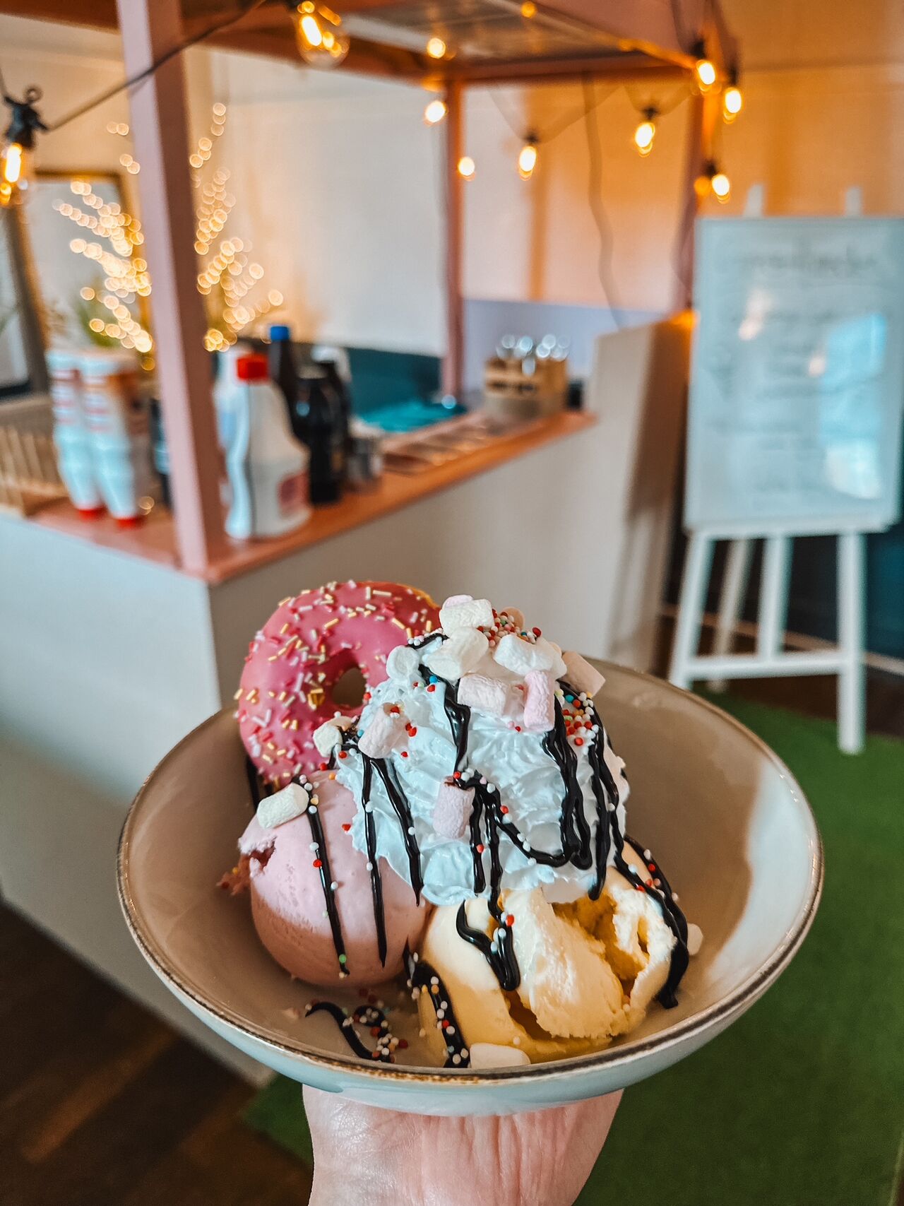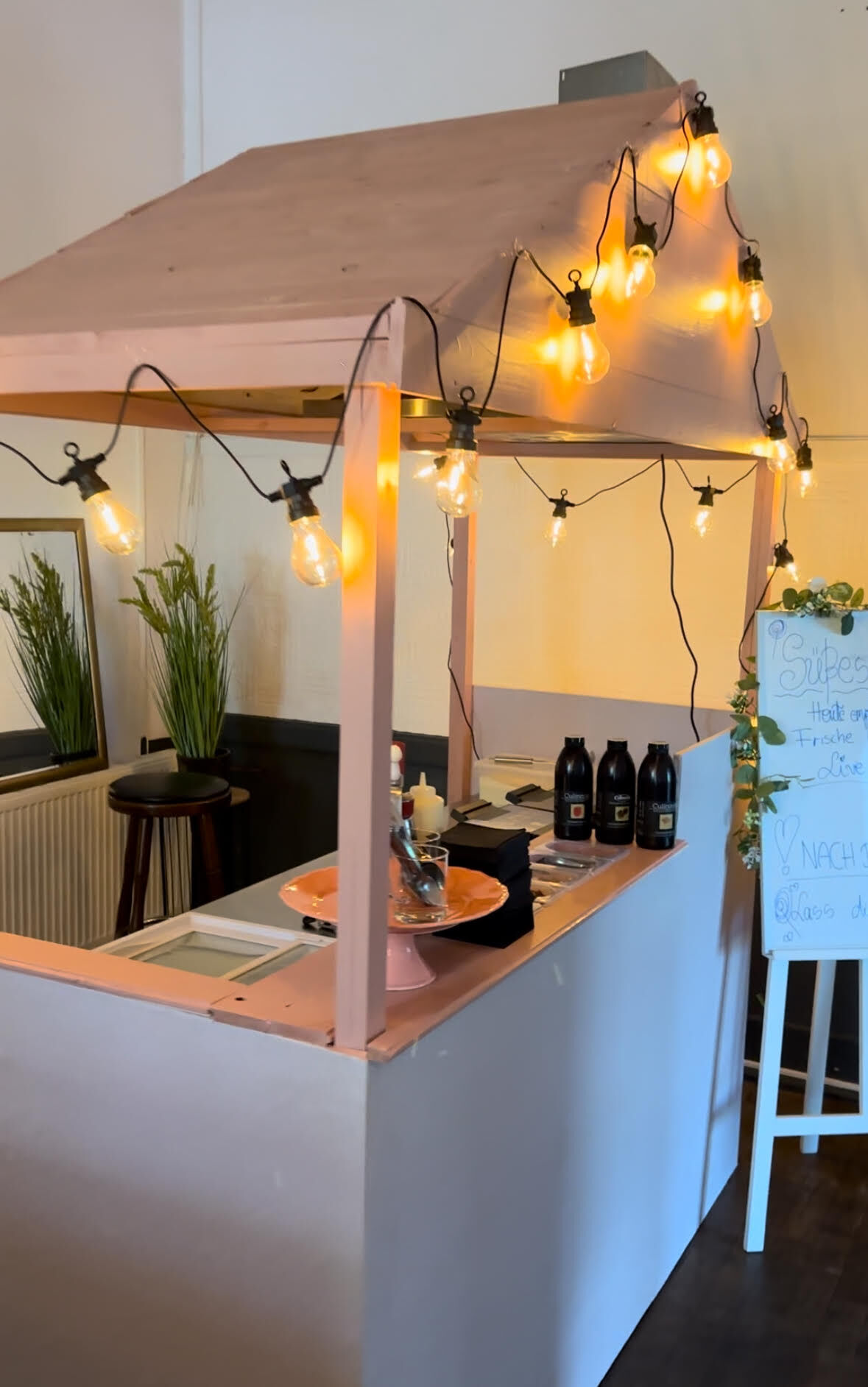 In unserem süßen rosa Haus können Sie auch ein Live-Erlebnis mit frittiertem Eis (FREITAGS), Waffeln (SAMSTAGS) oder Kugeleis (SONNTAGS) genießen.
