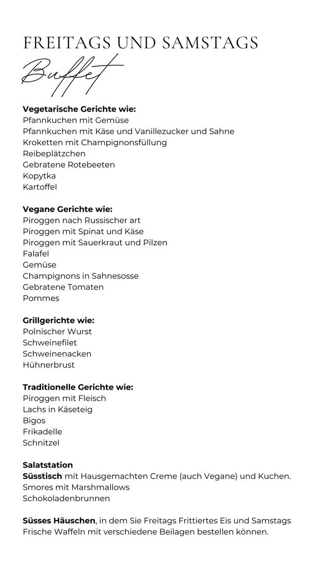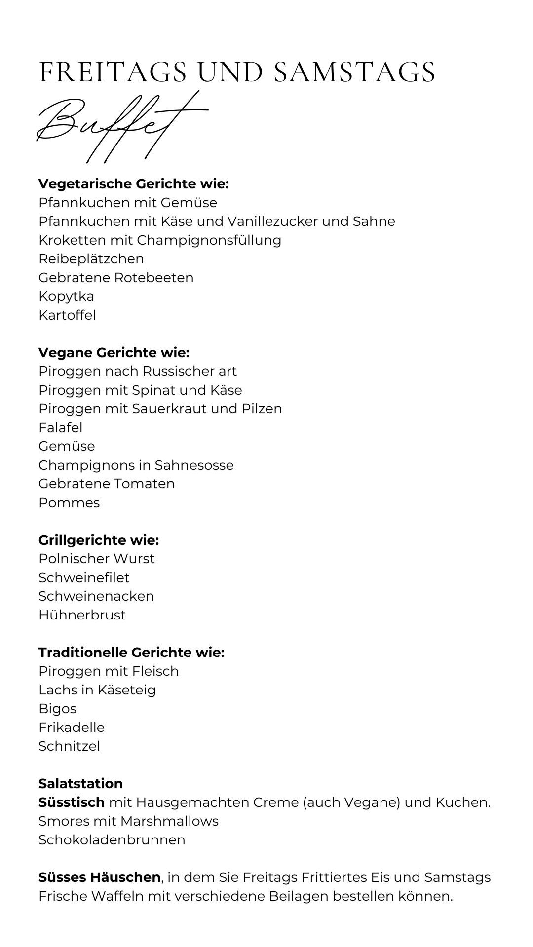 Von Freitag bis Sonntag bieten wir köstliche polnische Buffets an, die Freitags und Samtags auch vegane und vegetarische Gerichte umfassen. Sonntags können Sie sich klassische polnische Gerichte wie Rinderrouladen, Klösse oder De-volalie geniessen.